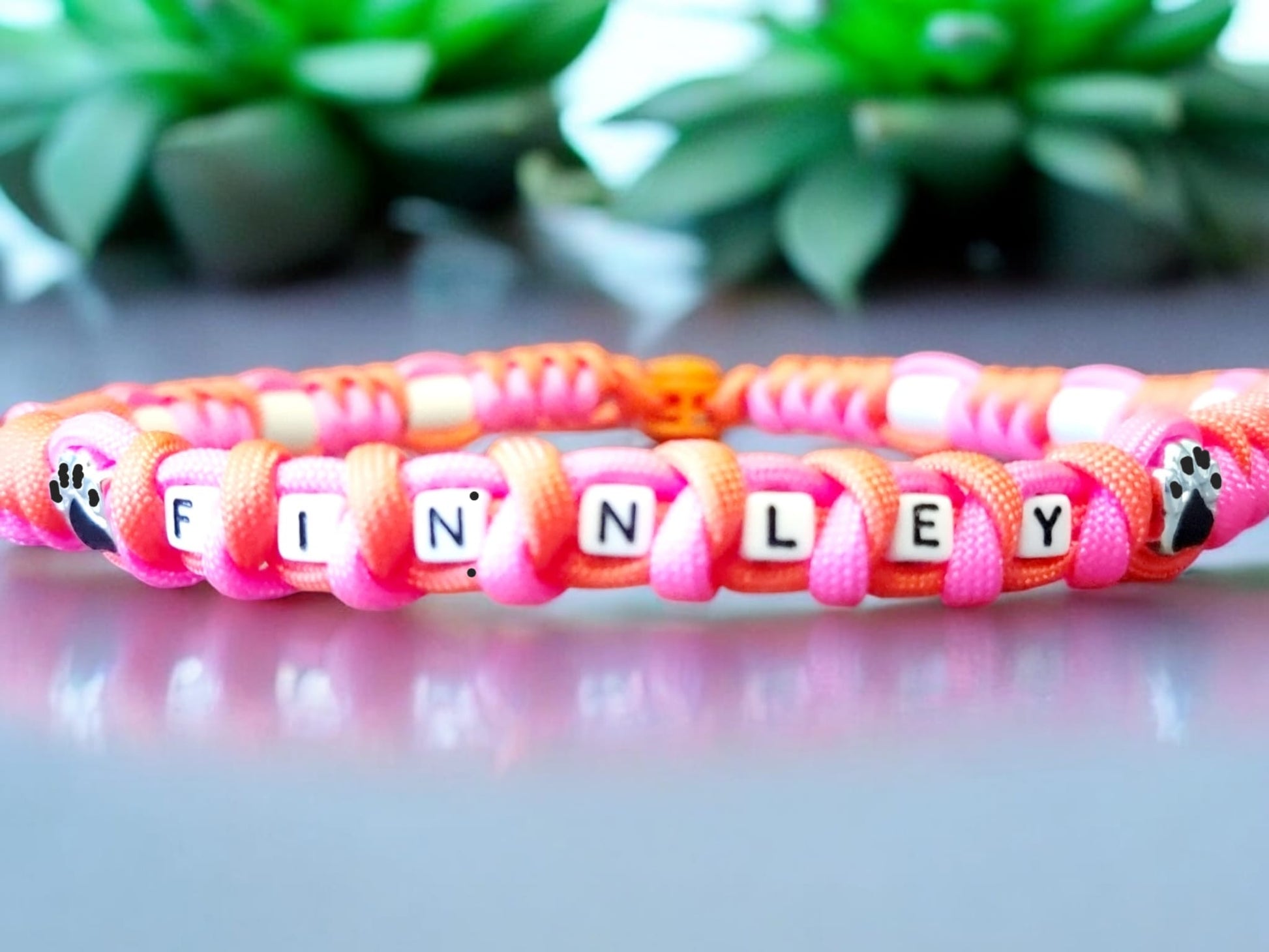 Wähle bis zu zwei Lieblingsfarben, die kunstvoll in das etwa 1,3 cm dicke Band geflochten werden. Dazu integrieren wir den Namen deines Hundes direkt ins Halsband – so trägt er immer ein Stück Persönlichkeit bei sich. Dank des praktischen Kordelstoppers lässt sich das Halsband flexibel anpassen. Zwei edle Edelstahlperlen am Kordelende machen den Look perfekt.
