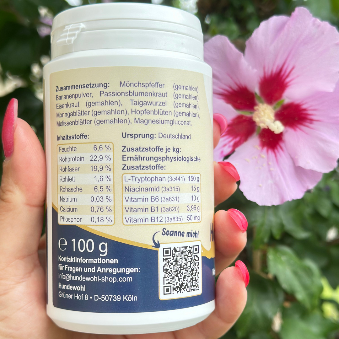 - Fördert das Wohlbefinden: Hilft deinem Hund, hormonelle Schwankungen besser zu bewältigen, ohne das Gleichgewicht zu stören.